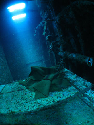 Nur do TV ;-). Najpierw kręcę trochę scen z Dianą i dziobem „Zenobii”, bo dzień jest słoneczny. Ale widoczność jest 15-20m, więc oczywiście nie ma mowy o nakręceniu chociaż połowy wraku za jednym zamachem. Później filmuje niebieskie butle z gazem i jakieś żyjątka przy suficie na upper car deck.