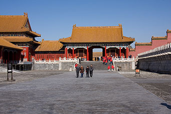 My sobie odpuszczamy - nie bawi nas oglądanie nieboszczyka. Po zrobieniu kilku zdjęć idziemy do Zakazanego Miasta. Jest to potoczna nazwa kompleksu pałacu cesarskiego Gugong, ponieważ przez 500 lat, w których mieszkali tam kolejni 24 cesarzy, zwykłym ludziom nie wolno było zbliżyć się do murów tego kompleksu. W skład tego kompleksu wchodzi 800 budowli, więc zobaczyć wszystko w normalnym czasie się nie da. Poza tym wg nas Zakazane Miasto jest przereklamowane. Ogromne terytorium z małą ilością zieleni i mnóstwem turystów. Budowle prawie wszystkie są takie same. Wewnątrz prawie nic nie można zobaczyć - niektóre pomieszczenia w ogóle zamknięte, niektóre mają otwarte drzwi, ale w drzwiach wisi łańcuszek, za który nie można przejść. A bez wejścia nic nie widać, bo wewnątrz jest bardzo ciemno. W związku z tym cały tłum stoi przed łańcuchem i błyska fleszami. W ogóle chińczycy nie są mocni w wyeksponowaniu eksponatów w takich pałacach. A za wejście biorą 60Y za osobę.