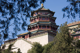 Dzisiaj jedziemy z Caren do Summer Palace, czyli Pałacu Letniego. Jest on już poza granicami miasta, ale da się tam dojechać autobusem za 2Y/os. Tak naprawdę jest to ogromny park z licznymi budynkami - pałacykami, świątyniami itd. 2/3 powierzchni parku zajmuje jezioro, dodatkowo park otaczają wzgórza, więc niektóre świątynie są wysoko. W miesiącach letnich cały dwór cesarski przenosił się tutaj. Park ten powstał w XI wieku, ale był zniszczony i odbudowany przez cesarzową wdowę Cixi, która była ostatnim przedstawicielem cesarstwa w Chinach. Była to bardzo dziwna i ekstrawagancka kobieta, która jadała 108-daniowe posiłki i za pieniądze przeznaczone na flotę morską wybudowała marmurową łódź, którą można dotychczas oglądać nad jeziorem. (Wiadomo, że nie pływa... ;). Jest tam też otwarty pasaż pokryty malowidłami (korytarz pod dachem) podobno najdłuższy na świecie (900m), aby spacerujący cesarze i ich żony nie byli narażeni na promienie słoneczne. Jak zawsze poszczególne budynki miały super odlotowe nazwy - np. Pawilon Życzliwości i Długowieczności, Pałac Cnoty i Harmonii, Pawilon Nefrytowych Fal, Pawilon Radości i Długowieczności.