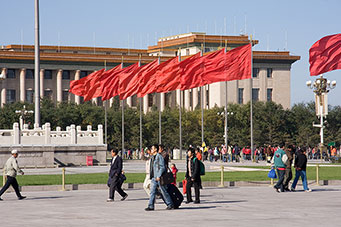 Po śniadaniu jedziemy na plac Tiananmen aby spotkać się z Caren. Plac faktycznie jest największy na świecie (ponad 40 ha) i robi wrażenie. Na nim w ciągu dnia jest mnóstwo ludzi, turystów i sprzedających wszelkiego rodzaju suweniry. Ale oprócz przejścia z jednego końca na drugi nie ma więcej co tam robić. Plac jest ogrodzony wokół barierkami i tylko w niektórych miejscach można wejść i wyjść. Nie wolno po nim jeździć, nawet rowerami. Po trzech stronach placu są duże budowle w stylu radzieckim - Pałac Narodu, Muzeum Historii Chin i Muzeum Rewolucji Chińskiej. Na środku placu jest mauzoleum Mao, do którego ciągle stoi duża kolejka - przecież wszyscy chińscy turyści muszą go odwiedzić.