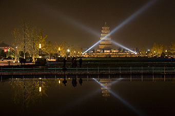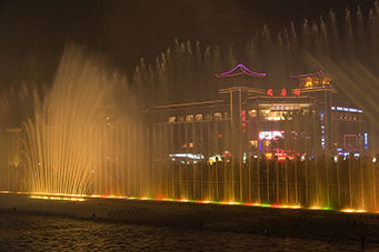 Wieczorem jedziemy specjalnie na pokaz "tańczących fontann". Poprzedniego dnia obok Wielkiej Pagody Dzikiej Gęsi o 12:00 zobaczyliśmy show ogromnych fontann do muzyki. Było to piękne i spektakularne w swoim rozmachu, bo fontanny są mniej więcej na terytorium 200x50 metrów umieszczone kaskadowo i ruszają się odpowiednio do klasycznej muzyki. A wieczorem to show jest jeszcze dodatkowo kolorowe. I nie rozczarowaliśmy się. Wieczorem było jeszcze piękniej, tylko ludzi 10 razy więcej. Bo widać, że takich jak my, przyjeżdżających specjalnie na ten pokaz jest bardzo dużo.