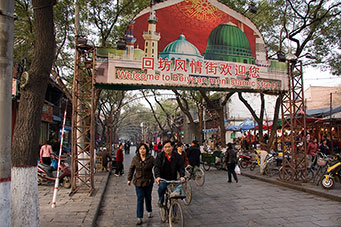Wiadomo, w dzielnicy muzułmańskiej jest dużo muzułman oraz chińczyków z arabskimi rysami twarzy (podobno są to potomkowie żołnierzy arabskich z VIII w.). Na głównej ulicy tej dzielnicy jest dużo różnych arabskich knajpek, straganów. Jesteśmy już bardzo głodni i chociaż chcieliśmy znaleźć jakąś konkretną knajpkę z przewodnika, to nie starcza nam cierpliwości i wchodzimy do dwupiętrowego lokalu, gdzie widzimy bardzo dużo ludzi i w menu napisanym na tablicy na zewnątrz rozpoznajemy jedno angielskie słowo: "buns". I chociaż po angielsku oznacza to słodką bułeczkę, to w Chinach oznacza to pierożki lub coś w rodzaju nadziewanych knedli (my też nazywaliśmy to "dumplings"). Wewnątrz na parterze wygląda to jak stołówka z długimi stołami ze stali nierdzewnej. Podchodzą do nas jakiś kelner i migami zaprasza nas na 1 piętro. Ok. Idziemy. Na górze widzimy salę jak w normalnej restauracji ze stołami z obrusami, zero gości i ok. 15 osób kelnerów stojących w 2 rzędy przed jakimś jak rozumiemy szefem, który czyta coś w rodzaju listy obecności (przynajmniej tak to rozumiemy). Ciekawie to wygląda - jak w wojsku. Ale nie chcemy być sami w sali z 15-toma kelnerami, więc schodzimy z powrotem do stołówki.
