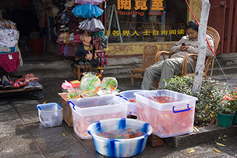 Caren zaprowadza nas jeszcze do galerii artystycznej, gdzie ona podobno pracuje. Jest tam dużo typowych chińskich malowideł na ryżowym papierze i przyklejonych na jedwab. Od małych do dużych. Niektóre bardzo ładne. Ale niestety cena - 200Y za jeden o wielkości ok. 40x100 cm! A zazwyczaj jest to komplet "4 pory roku", więc najlepiej kupić wszystkie za 800Y. Drogo. Poza tym teraz nic nie możemy nawet kupić, ponieważ przed nami cała podróż, i te malowidła po prostu nie przetrwają. Niektóre są naprawdę majstersztykami - malowane z najdrobniejszymi szczegółami. Trzeba będzie zastanowić się nad kupnem w drodze powrotnej.