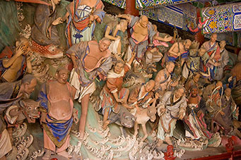 Potem podjeżdżamy miejskim autobusem do "Świątyni Łaski" - Dacien Si wraz z Wielką Pagodą Dzikiej Gęsi. Świątynia należy do największych w Xi'anie i była założona w 647 r.. W poszczególnych komnatach są przepiękne buddyjskie rzeźby z różnych materiałów, ale najpiękniejsze są chyba z nefrytu. Wielka Pagoda ma ponad 60m wysokości, więc po długim i męczącym wejściu na ostatni jej poziom można zobaczyć panoramę miasta wraz z ciężkim smogiem wiszącym nad nim. Takie wrażenie, jakby ciągle była mgła, która mniej więcej po 10 metrach w górę pokrywa wszystko jak mleko.