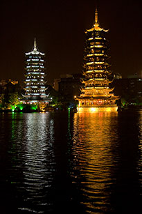 W tym dniu za daleko nie chodzimy, ale dochodzimy do dwóch otoczonych drzewami jezior w centrum miasta – Rong Hu (Jezioro Banianów) i Shan Hu (Jezioro Jodeł) - pozostałości fosy wokół wewnętrznych murów obronnych. Nad jeziorem Jodeł wznoszą się dwie 40 metrowe pagody Riyue Shuang Ta. Wieczorem są one ładnie podświetlone.