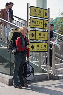 Dlatego też bezpośrednio z lotniska specjalnym autobusem za 20Y od osoby jedziemy do dworca kolejowego. Niedaleko niego wchodzimy na estakadę która w końcu prowadzi do przejścia granicznego z Hongkongiem (HK). Ciekawe, że obok tej estakady dla pieszych jest nawet kierunkowskaz w którą stronę iść do HK.