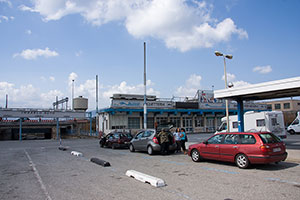 Jest ciemno, ale mamy gdzie spać, więc wyruszamy w poszukiwaniu kolacji do miasta. Rozpakowując torbę, z przerażeniem zauważam, że prom na Maltę wypływa o 9:15 i nie ma promu popołudniowego. Gonimy więc najpierw do portu, akurat trwa odprawa na nocny prom, wiec dowiadujemy się o ceny biletów i godzinie odprawy (7:45, kurczę) i w końcu idziemy do pizzerii nieopodal.